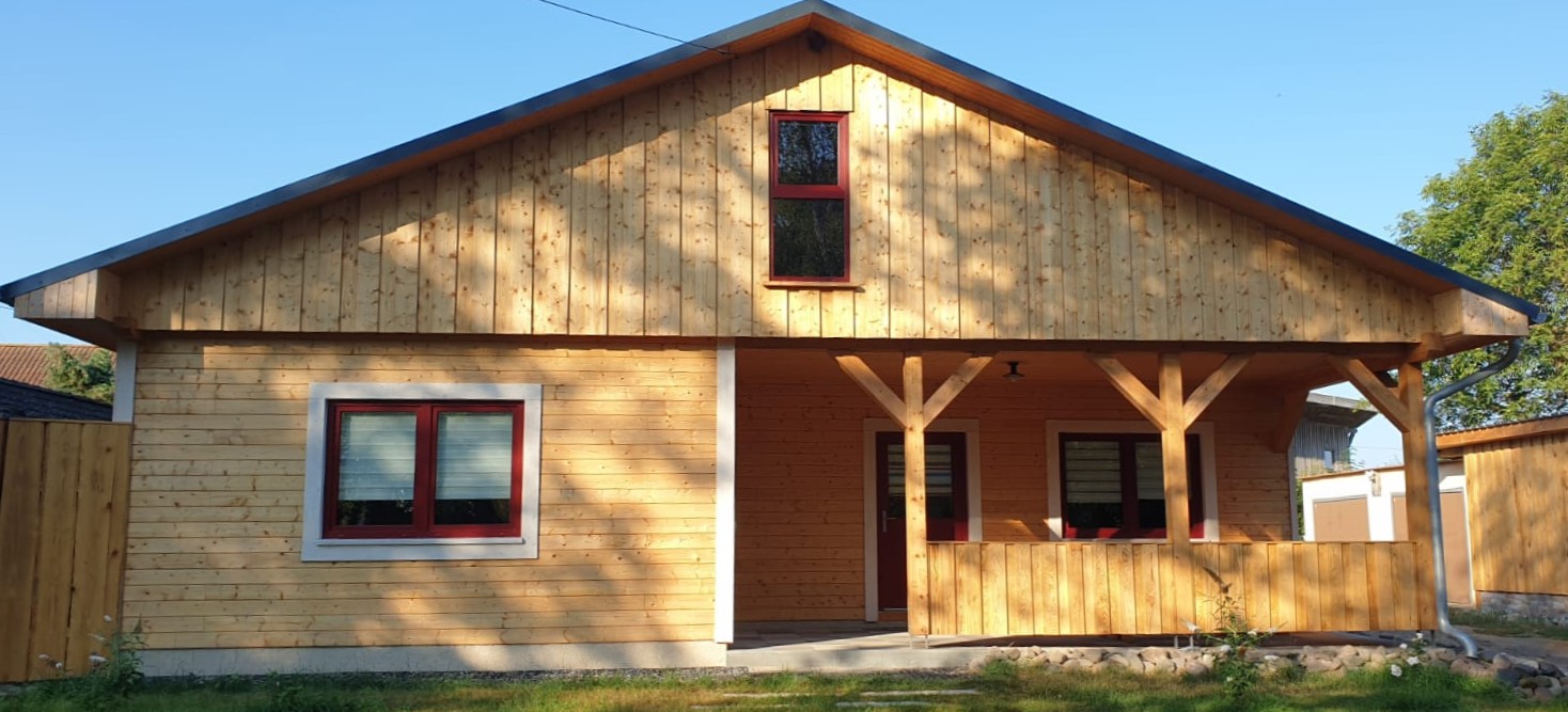 Es ist ein großes Holzhaus mit 2 Terassen und Sauna, mit geschützter Sitzmöglich im Freien, am Dorfrand gelegen.